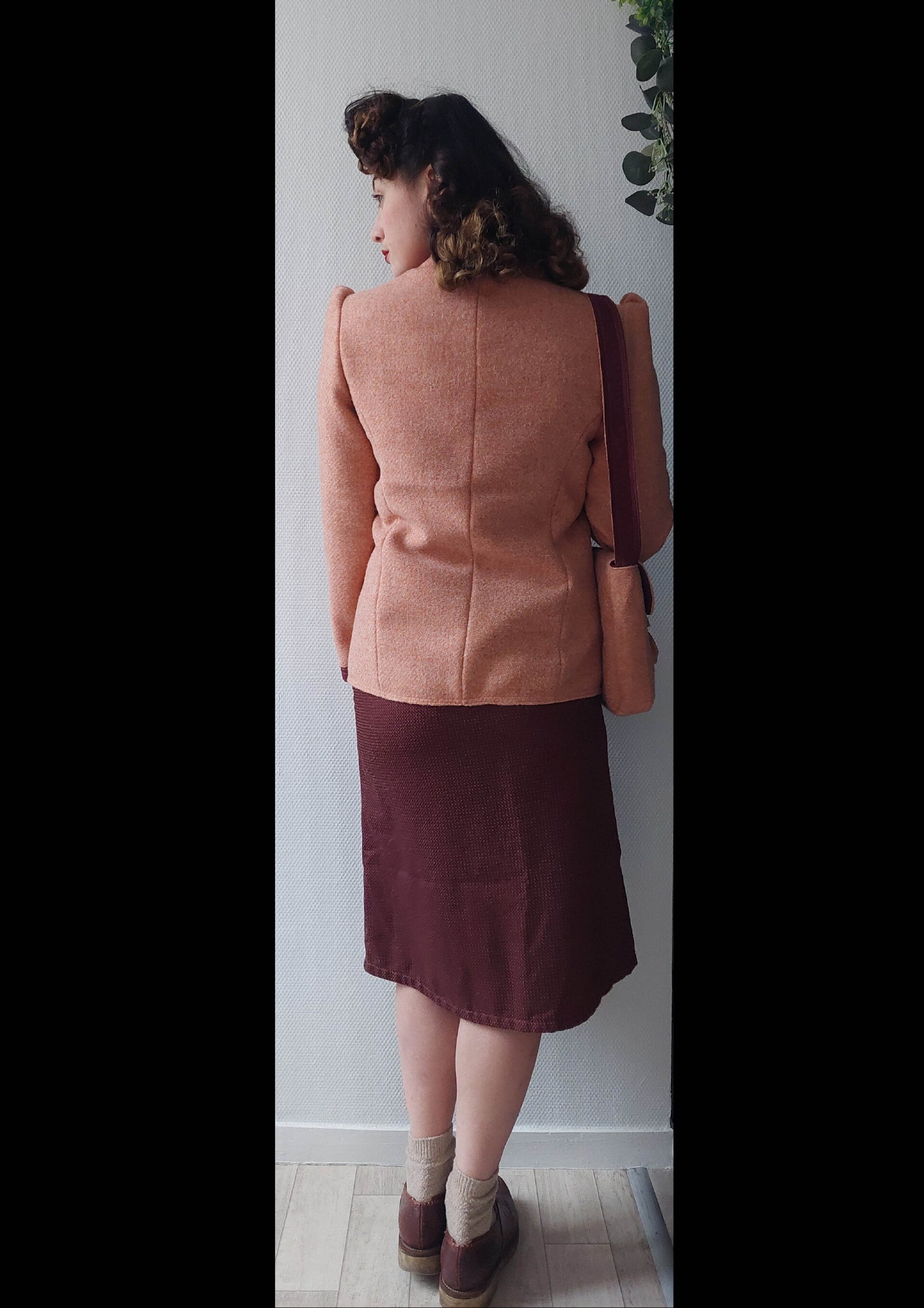 Veste en lainage de couleur Abricot avec doublure interieur et détails (poches, boutons, pattes avant et bout de manches) de couleur Bordeaux.